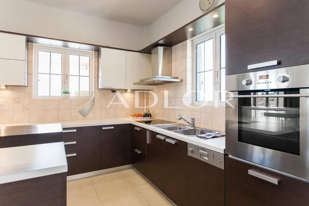 Im Außenbereich befindet sich ein gepflegter Garten mit Rasen, Bäumen und einem großen Swimmingpool mit Meerblick. Darüber hinaus gibt es einen überdachten Bereich mit einem Esszimmer und eine geschlossene Garage mit drei Stellplätzen.